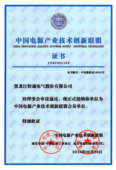 特通電氣各項(xiàng)標(biāo)準(zhǔn)符合中國(guó)電源工業(yè)協(xié)會(huì)的要求,于2016年06月15日成為“中國(guó)電源產(chǎn)業(yè)技術(shù)創(chuàng)新聯(lián)盟”會(huì)員單位。