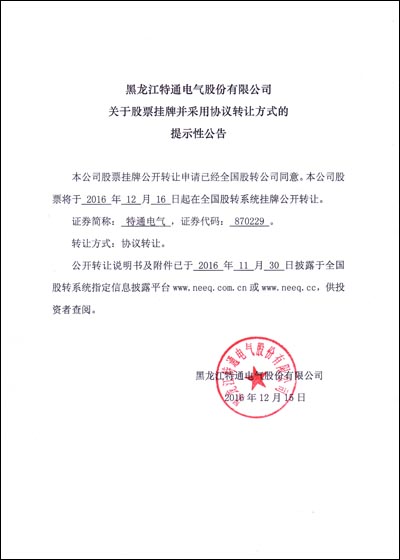 黑龍江特通電氣股份有限公司于2016年12月16日在全國(guó)中小企業(yè)股份轉(zhuǎn)讓系統(tǒng)(新三板)掛牌公開轉(zhuǎn)讓,證券簡(jiǎn)稱:特通電氣,證券代碼:870229。特通電氣在全國(guó)中小企業(yè)股份轉(zhuǎn)讓系統(tǒng)成功掛牌,標(biāo)志著公司正式進(jìn)入資本市場(chǎng),開啟了公司發(fā)展的新篇章。